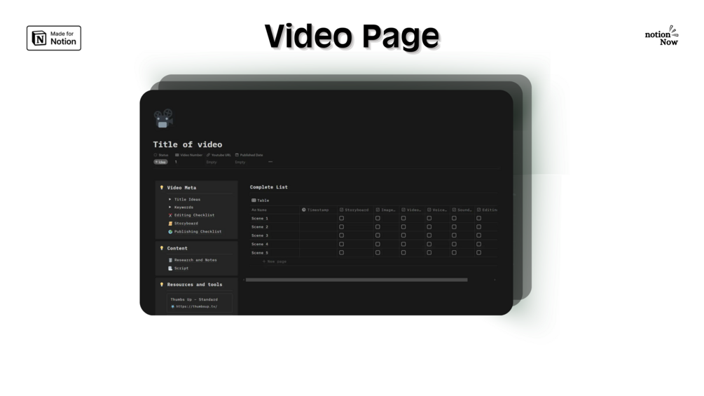 The template features an intuitive navigation structure with dedicated spaces for Ideas, Script, and Video production. Each section is thoughtfully organized to maintain a clear workflow from concept to final publication.